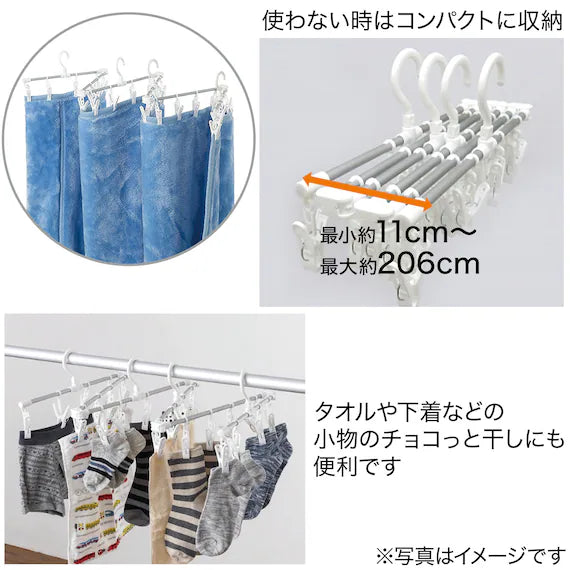 ● The frame can be stretched to any size you like ● Large laundry such as sheets and blankets can be hung out to dry ultra-slim ● You can effectively use a narrow space ● The pinch that opens wide makes it easy to fit thick laundry