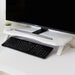 The monitor stand fits within the width of a monitor up to 23.8 inches, and the leg spacing is 49 cm, so a large gaming keyboard can be stored.